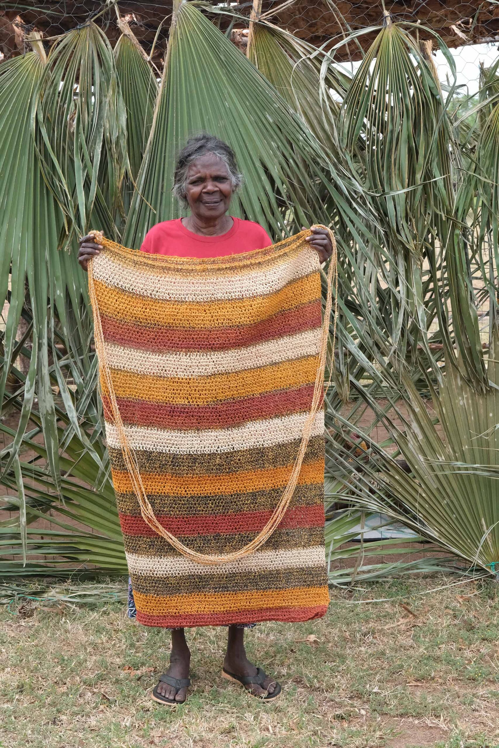 Helen Ganalmirriwuy created a series of woven objects using natural, undyed gunga (pandanus). These included mindirr (dilly bags) and baskets made using a twined lattice weave, as well as djinbakara (conical bags with a slit) and ganybu (fishing nets). She recalls watching her parents make fishing nets, baskets, and dilly bags in this style while growing up.