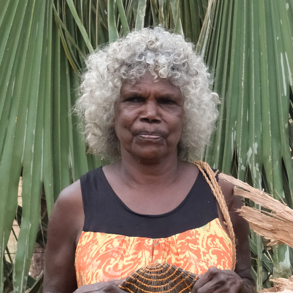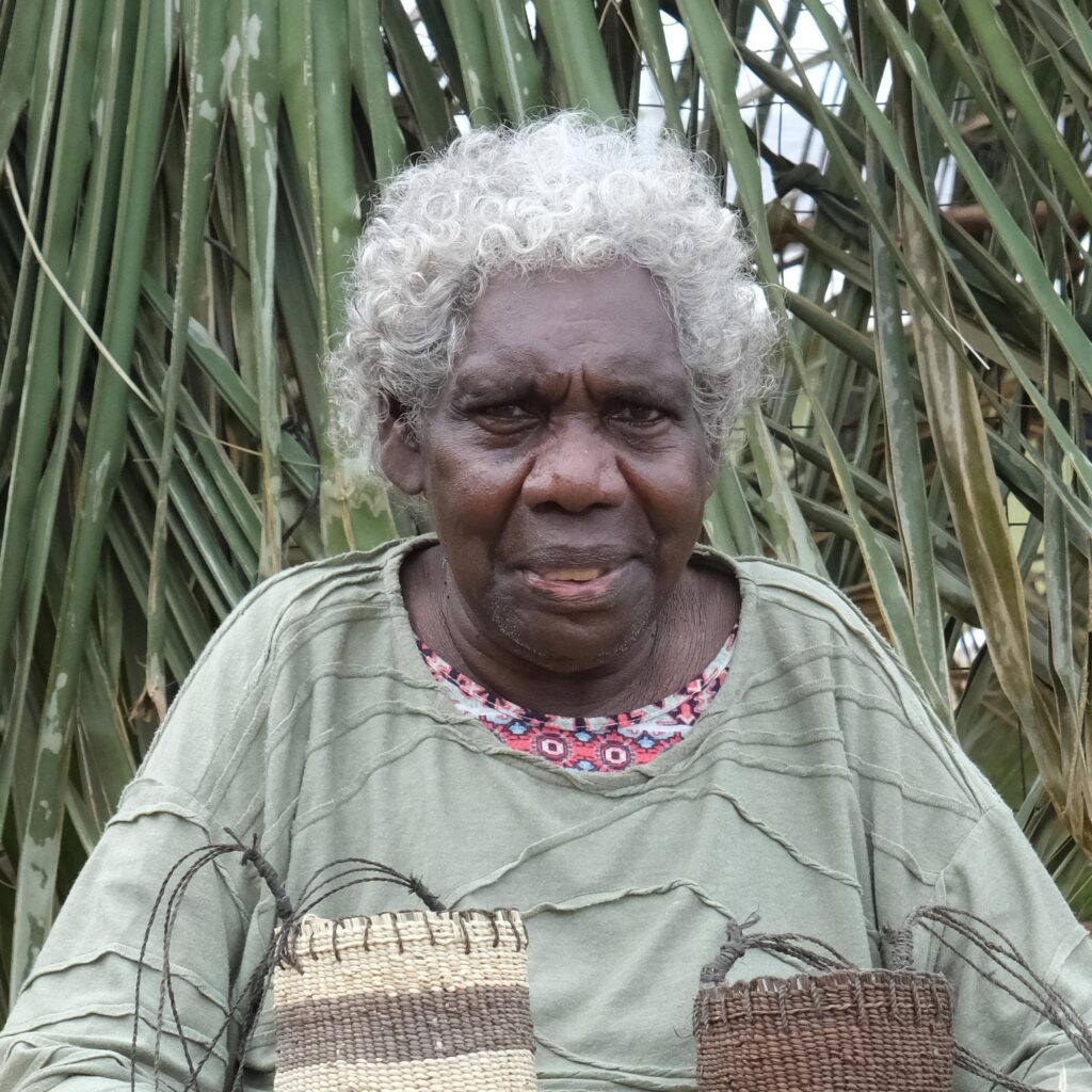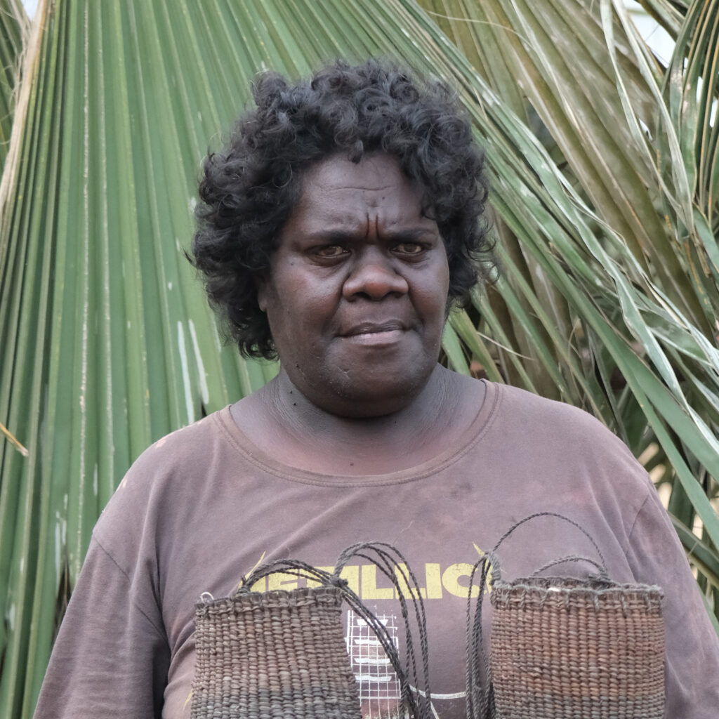Abigail grew up surrounded by her aunties and observed their weaving and contributed to the daily routines of harvesting and preparing bush fibres. Abigail is passionate about ceremonial life and is known for her graceful ceremonial dancing and bush knowledge. During Laŋarra Bush Gallery Abigail worked alongside Traditional Owners to welcome artists and vistor’s to Laŋarra.