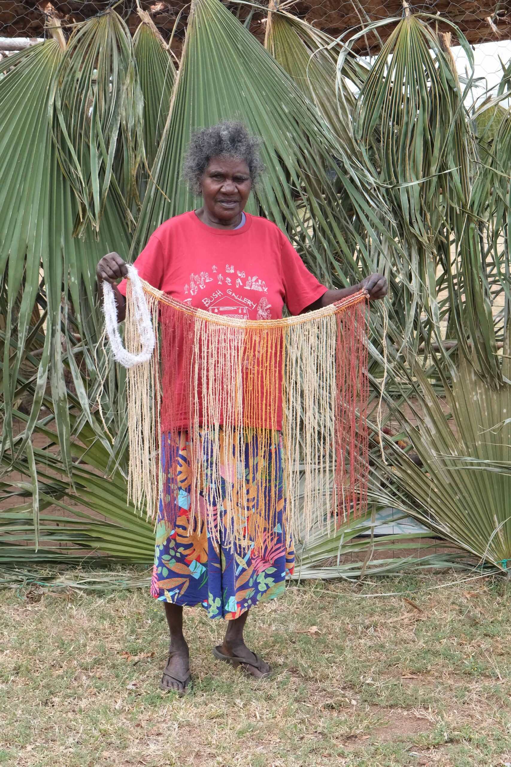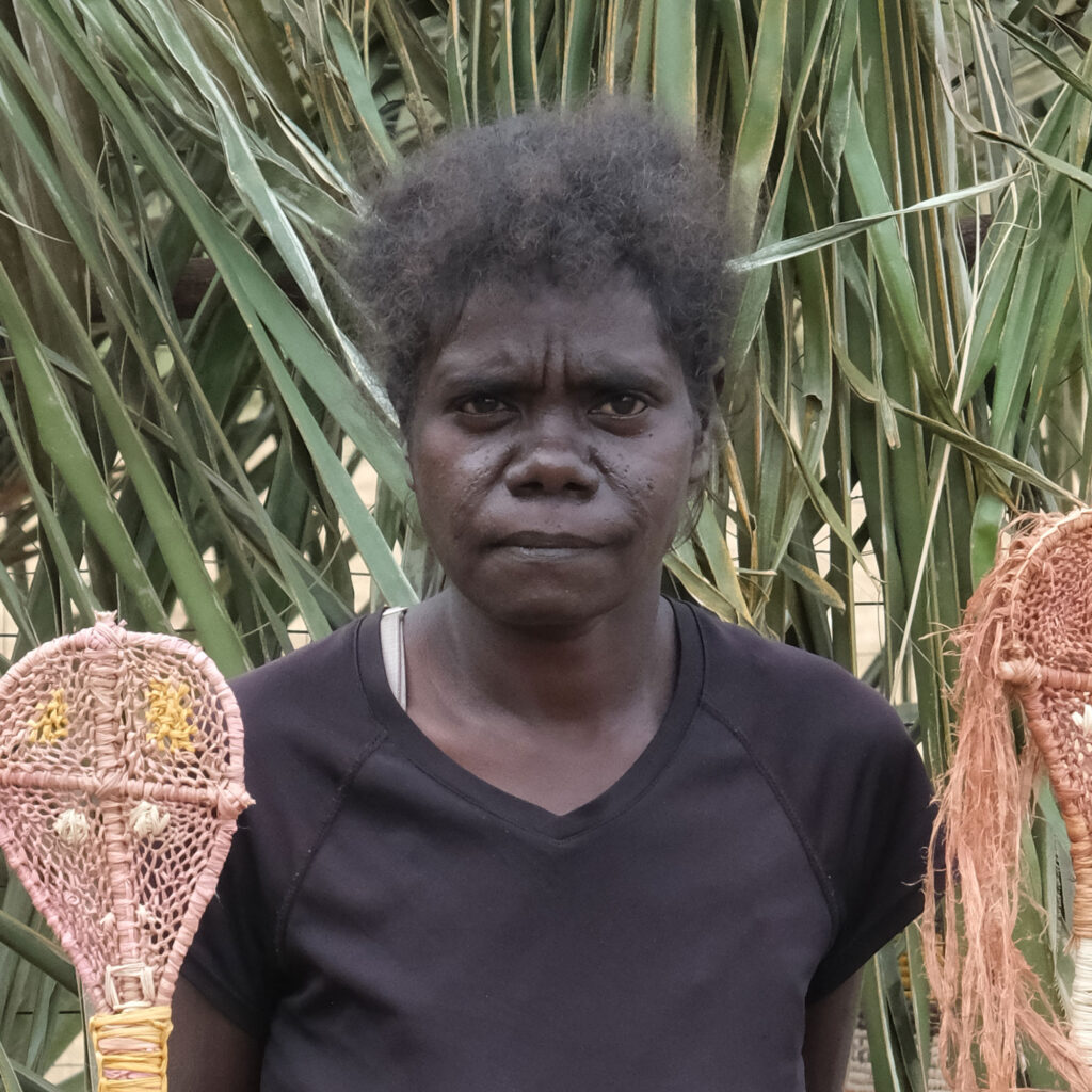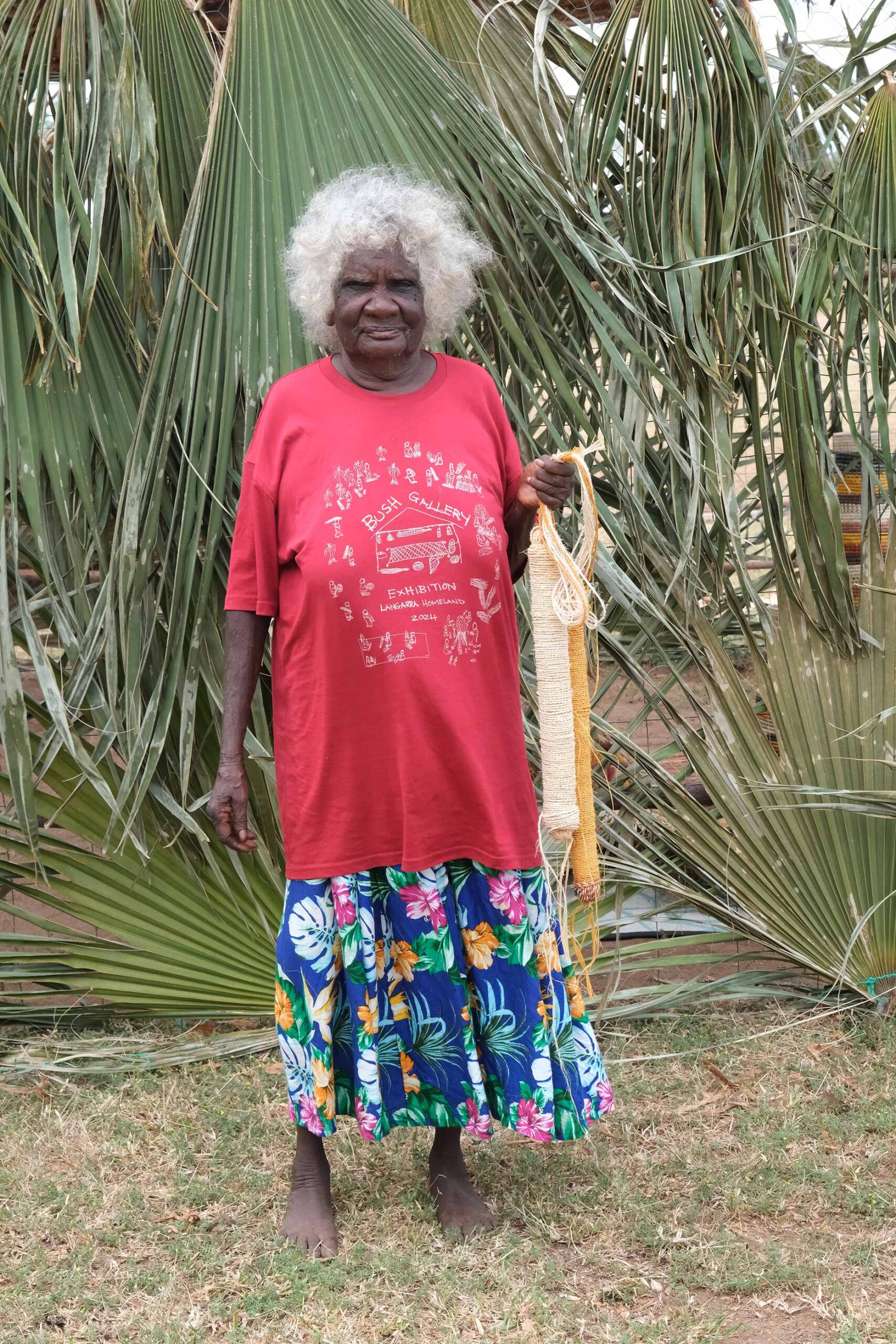 Abigail grew up surrounded by her aunties and observed their weaving and contributed to the daily routines of harvesting and preparing bush fibres. Abigail is passionate about ceremonial life and is known for her graceful ceremonial dancing and bush knowledge. During Laŋarra Bush Gallery Abigail worked alongside Traditional Owners to welcome artists and vistor’s to Laŋarra.