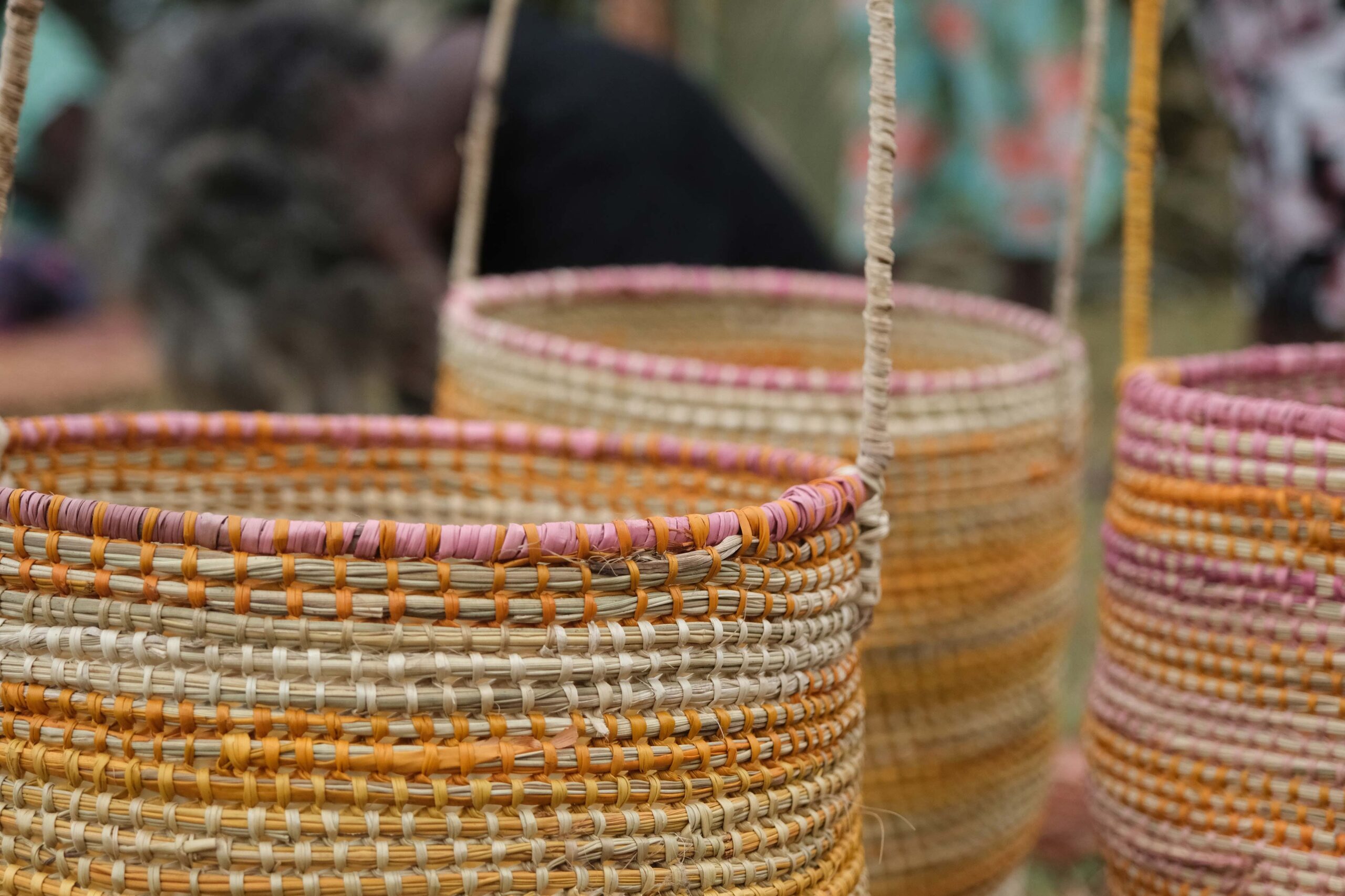 Gapuwiyak artists presented works that showcased their extraordinary colour palette—from the subtle variations of natural materials to bold, contrasting bands achieved through dye baths. They worked with fibres including pandanus, kurrajong, and bush cane, combining traditional weaving techniques with innovative patterns. The artists created pieces that reflected both cultural continuity and individual expression.