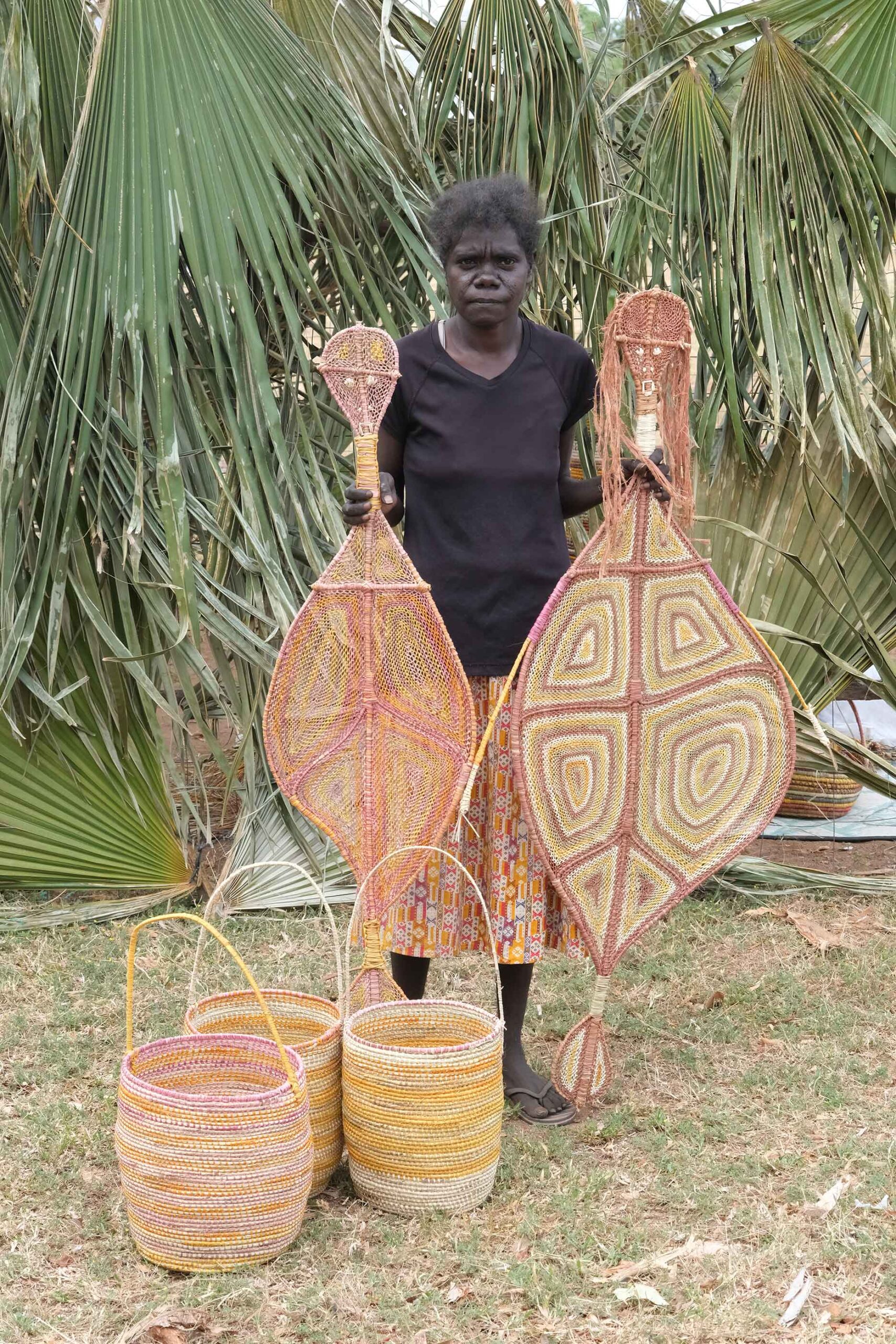Julieanne Gitjpulu Malibirr has been working on large rectangular pieces inspired by her work on Country to Couture runways, and included some baskets made of split dharwir (bush cane).