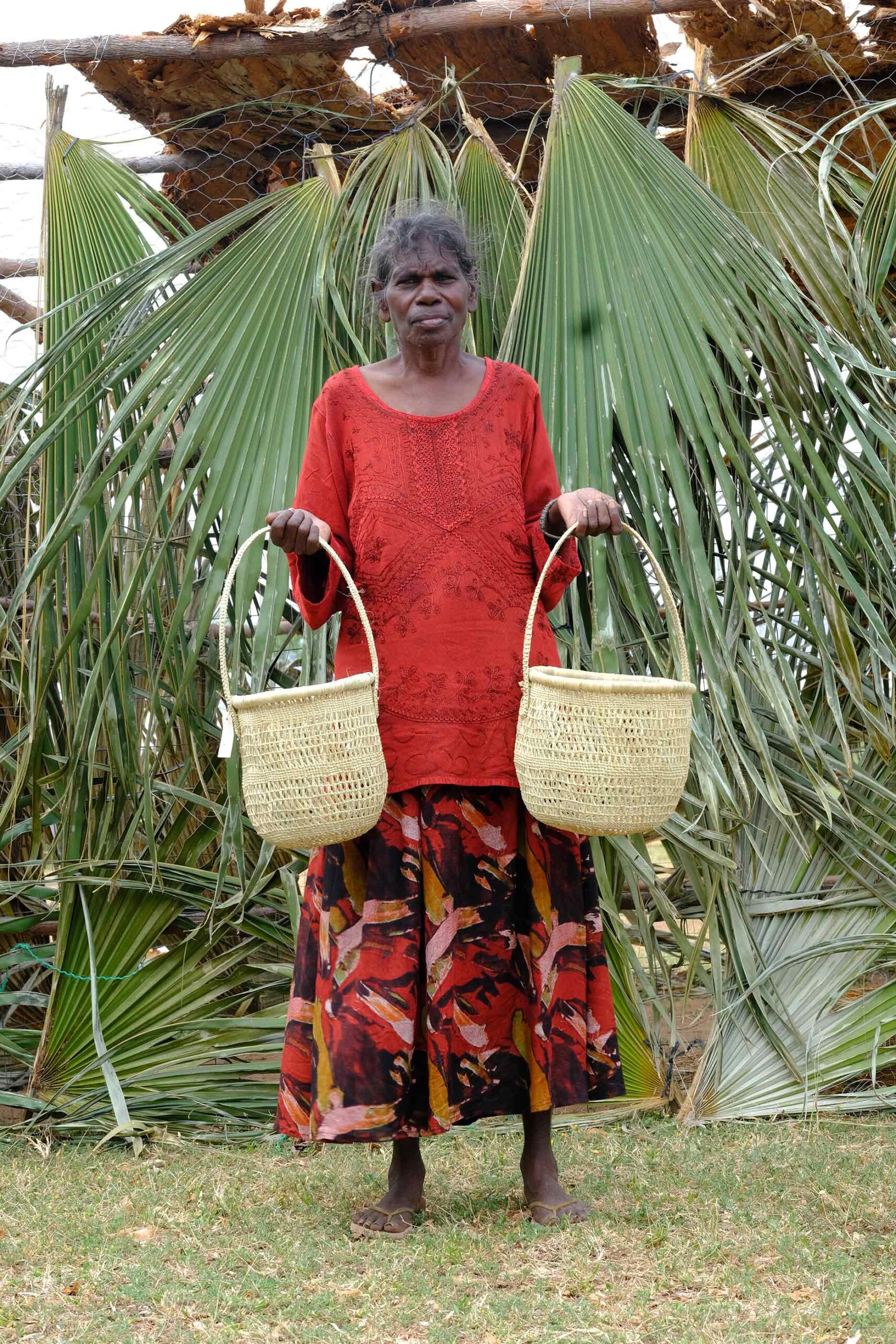 Doreen Jingarrarrabarra specialises in conical dilly bags (burlupurr), woven string bags and mats. She uses a range of natural fibres, including pandanus, mirlarl (jungle vine/malaisia scandens), sedge grass and kurrajong. Unlike most West Arnhem weavers, she does not dye the fibres with natural pigments, preferring the subtly of the natural variations in colour and tone. She is renowned for her fine weave and intricate designs, which she attributes to learning from her mother.