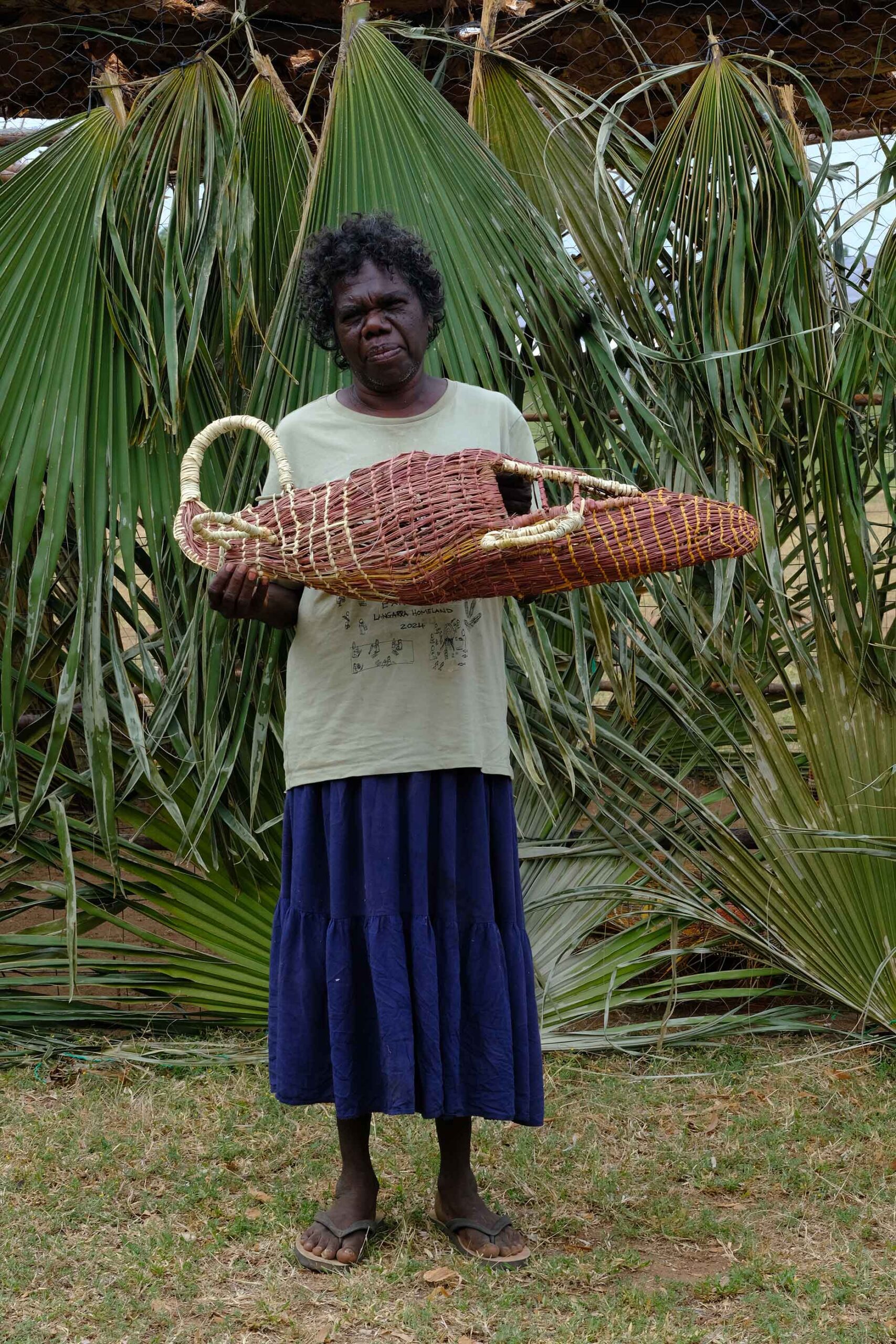 Freda Wayartja is a master weaver and cultural leader and educator. Wayartja is one of a handful of Arnhem Land artists that continue to make bamagora (conical mat). For Laŋarra Bush Gallery Wayartja was excited to extend on the bamagora concept and sculpted a baby wrapped in paperbark to lie underneath the bamugora.