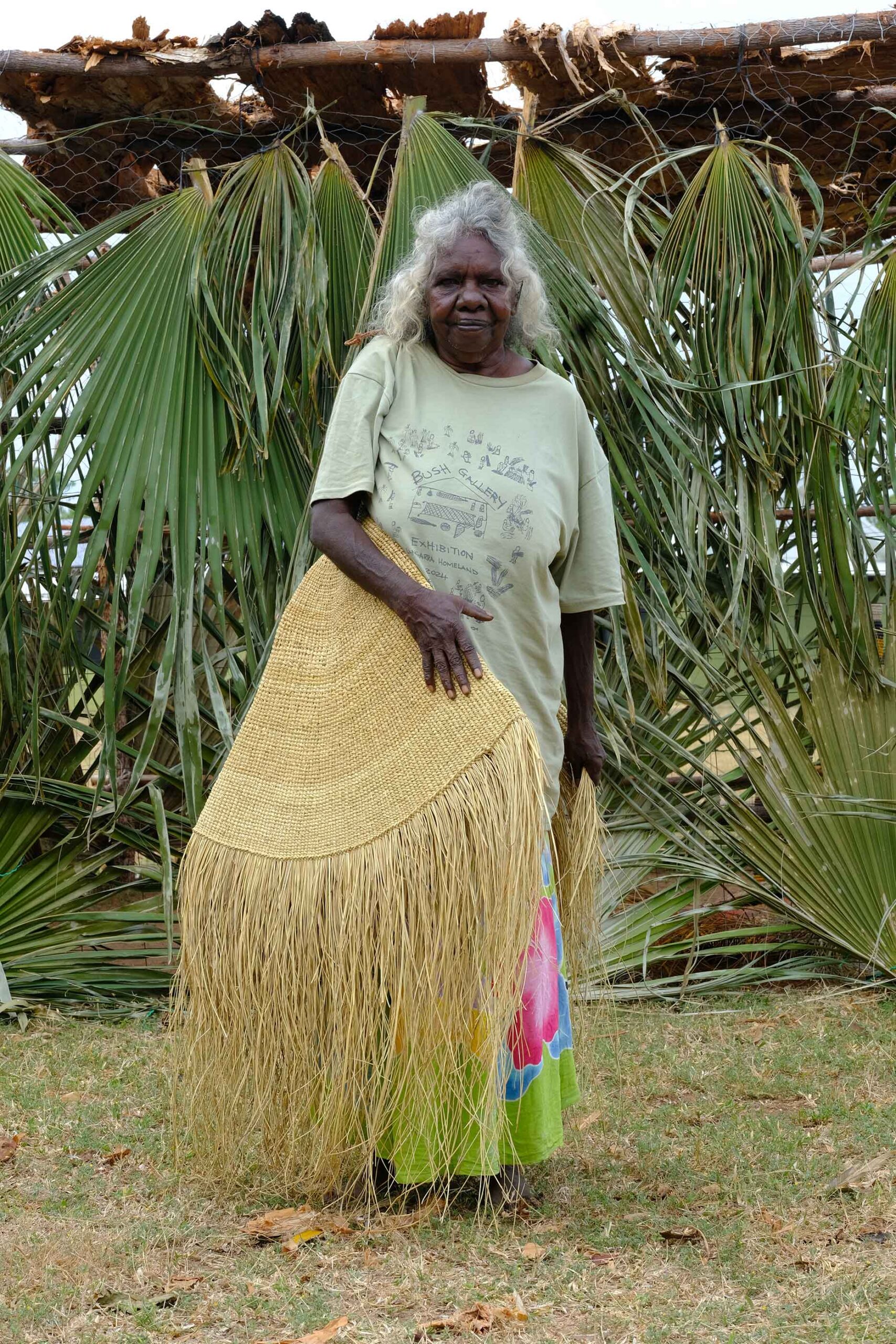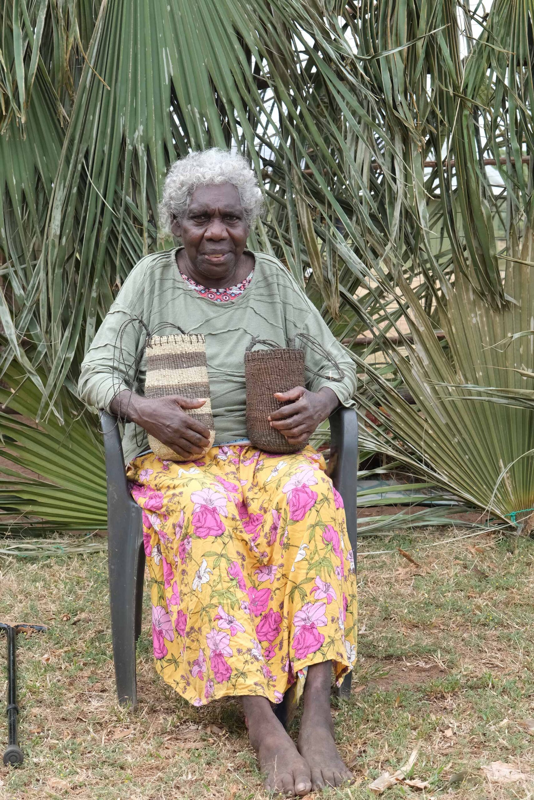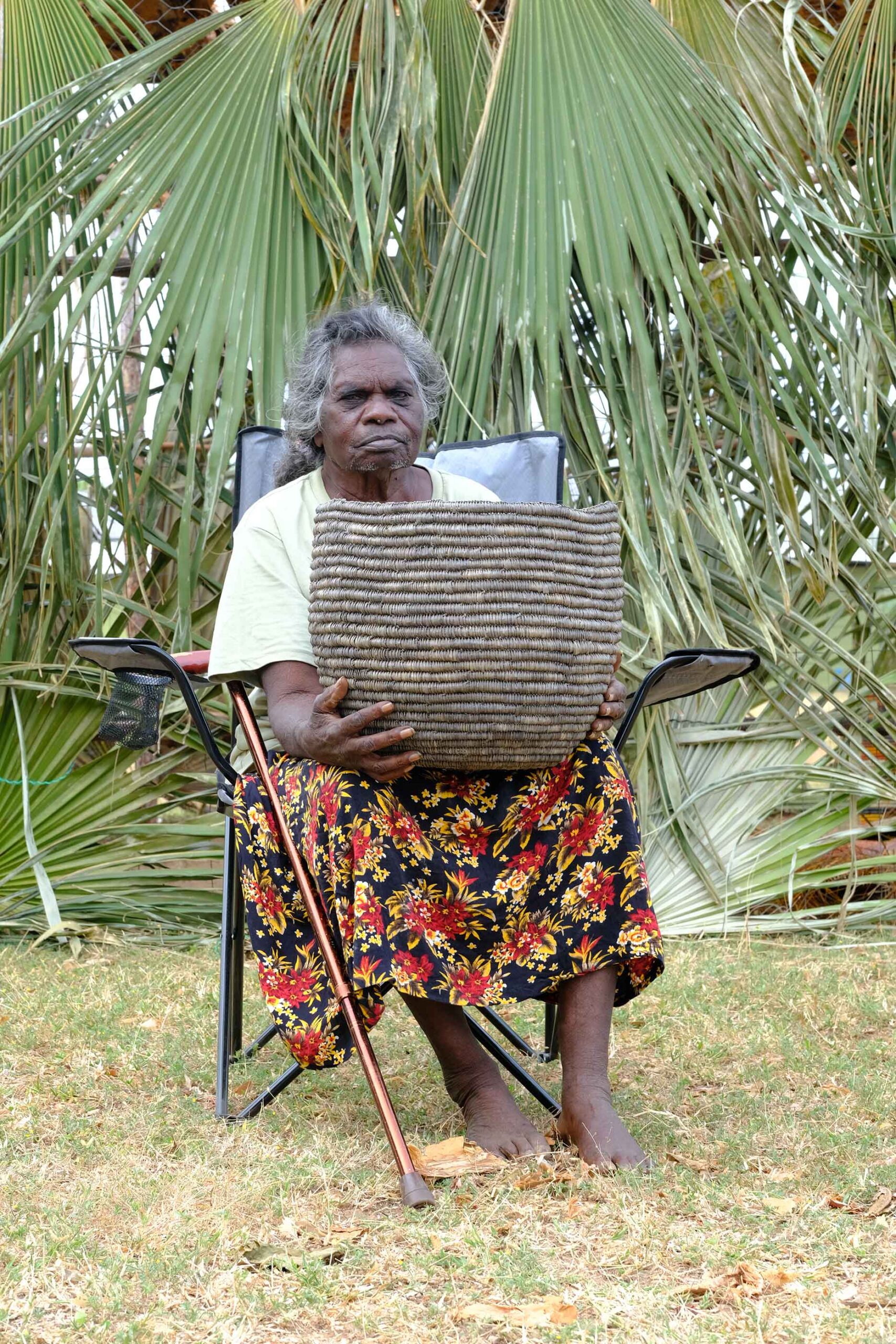 Balbunga’s art practice is informed by her lived experiences growing up in the bush and the knowledge and skills she acquired from her elders, such as learning how to harvest, prepare and paint hollow logs and barks from her father. She continues to make traditional fibre objects, including the revered bamugora (conical mat).