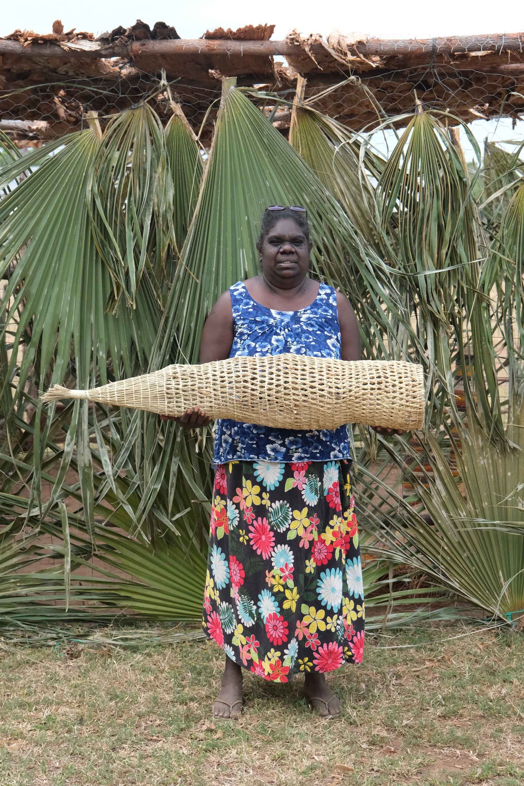 Sabrina Rräthi Roy, although a senior weaver, continues to learn the art of making an-gujechiya (fish traps) from her ŋäṉḏi (mother and mother’s sisters), Lily Roy, Freda Wayartja and Bonnie Burangarra. For Bush Gallery Sabrina made her fist an-gujechiya using a lattice twining technique.