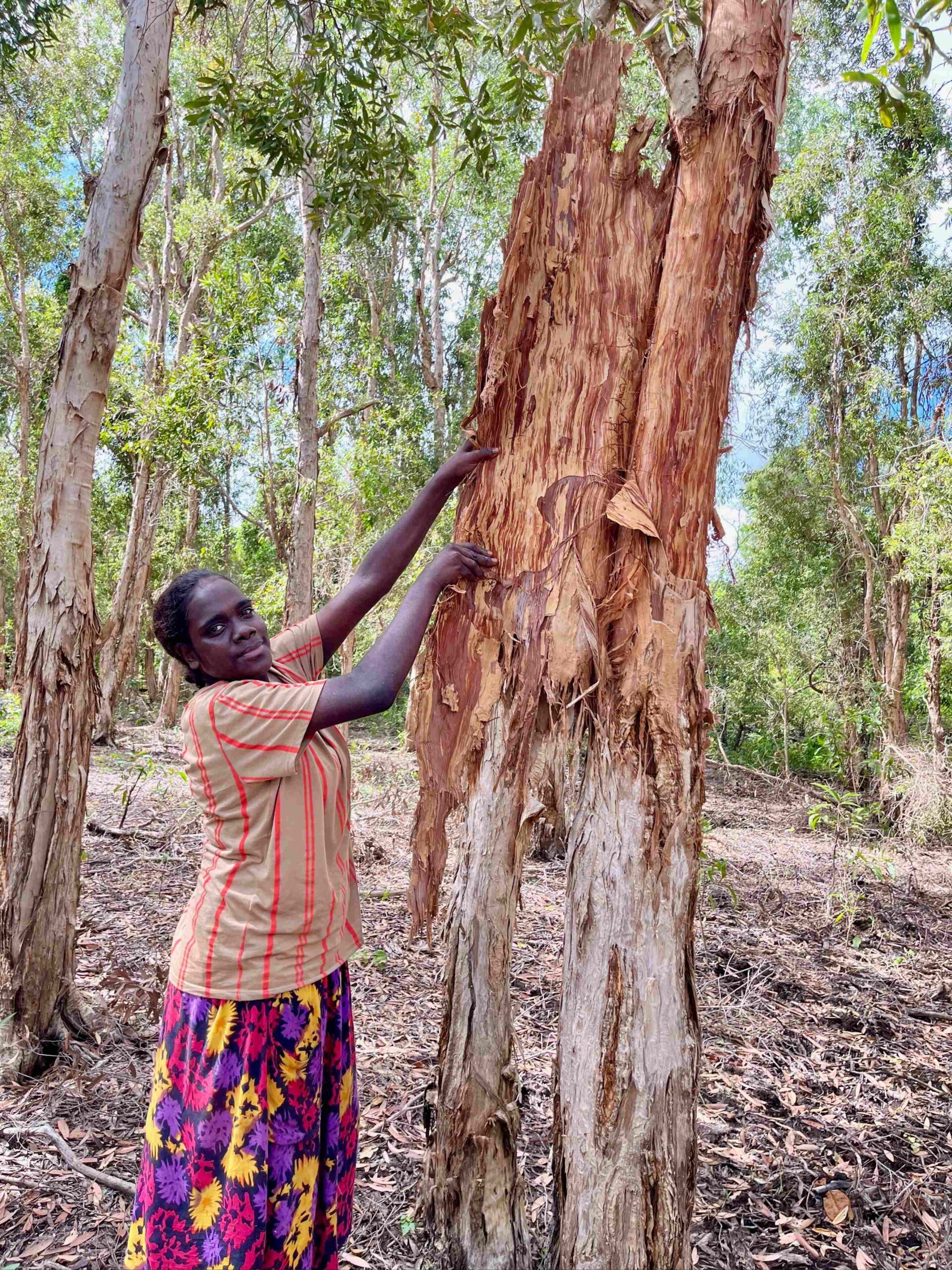 Susan Yirrawurr, daughter of senior artist Helen Ganalmirriwuy, lives and works at Laŋarra homeland. Yirrawurr prepared the site for Laŋarra Bush Gallery 2024, together with her children and grandchild she harvested dharpa ga raŋan (wood and paperbark) for the five bush galleries.