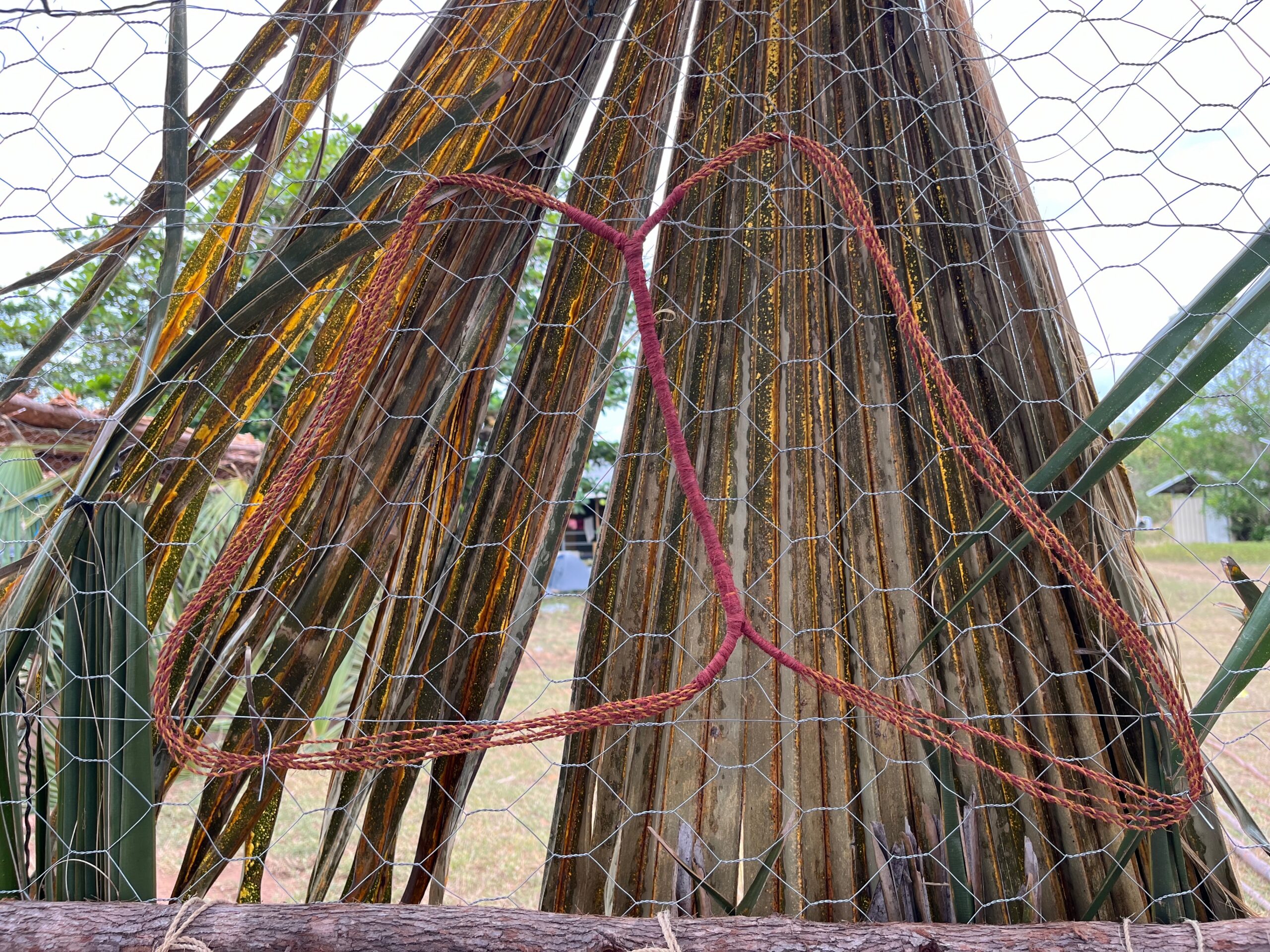 Senior weaver Julie shared that she made string pieces for the exhibition that had not been created for a long time. The Bush Gallery offered her the opportunity to revisit these older, deeply cultural pieces and re-make them specifically for this body of work, drawing on knowledge and techniques that sit deep within her practice. Creating these pieces was significant for Julie, allowing her to bring rarely seen items back into view and to honour older ways of making through work created on Country for the exhibition.